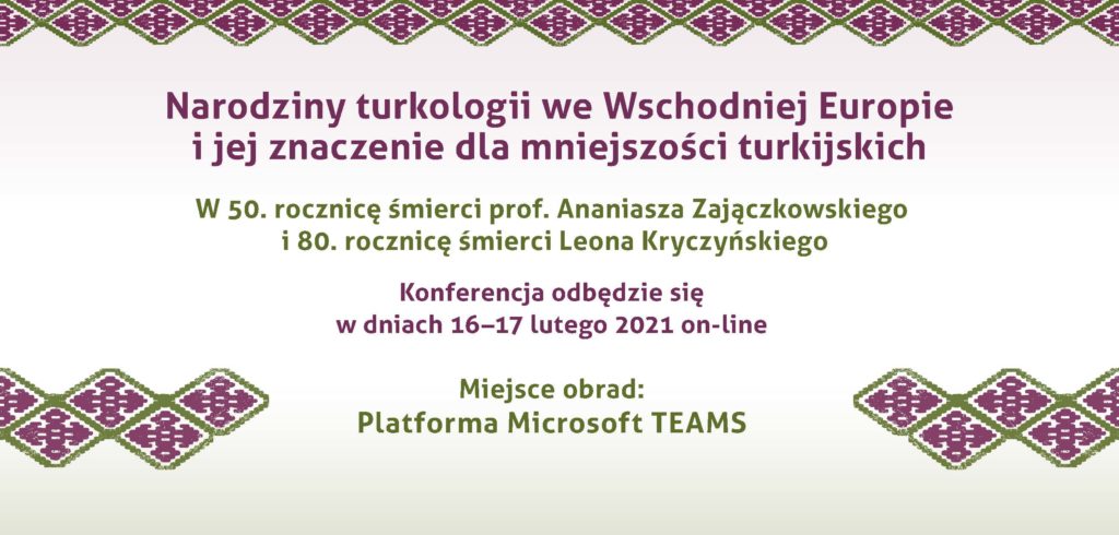 Międzynarodowa konferencja naukowa pn. Narodziny turkologii we Wschodniej Europie i jej znaczenie dla mniejszości turkijskich. W 50. rocznicę śmierci prof. Ananiasza Zajączkowskiego i 80. rocznicę śmierci Leona Kryczyńskiego (The Beginnings of Turkology in Eastern Europe and its Importance for Turkic minorities. Commemorating the 50th anniversary of Prof. Ananiasz Zajączkowski’s and the 80th anniversary of Leon Kryczyński’s deaths) zaplanowana została w roku 2020 na Uniwersytecie Mikołaja Kopernika w Toruniu. W związku z sytuacją pandemiczną odbędzie się on-line w dniach 16-17 lutego 2021 na platformie MS TEAMS.